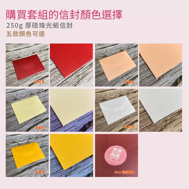 ★套組含250g厚磅珠光信封(16x11cm),12款顏色可選和3cm囍字圓形貼紙。