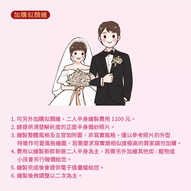 4. 費用以繪製新郎新娘二人半身為主,若需另外加繪其他如:寵物或